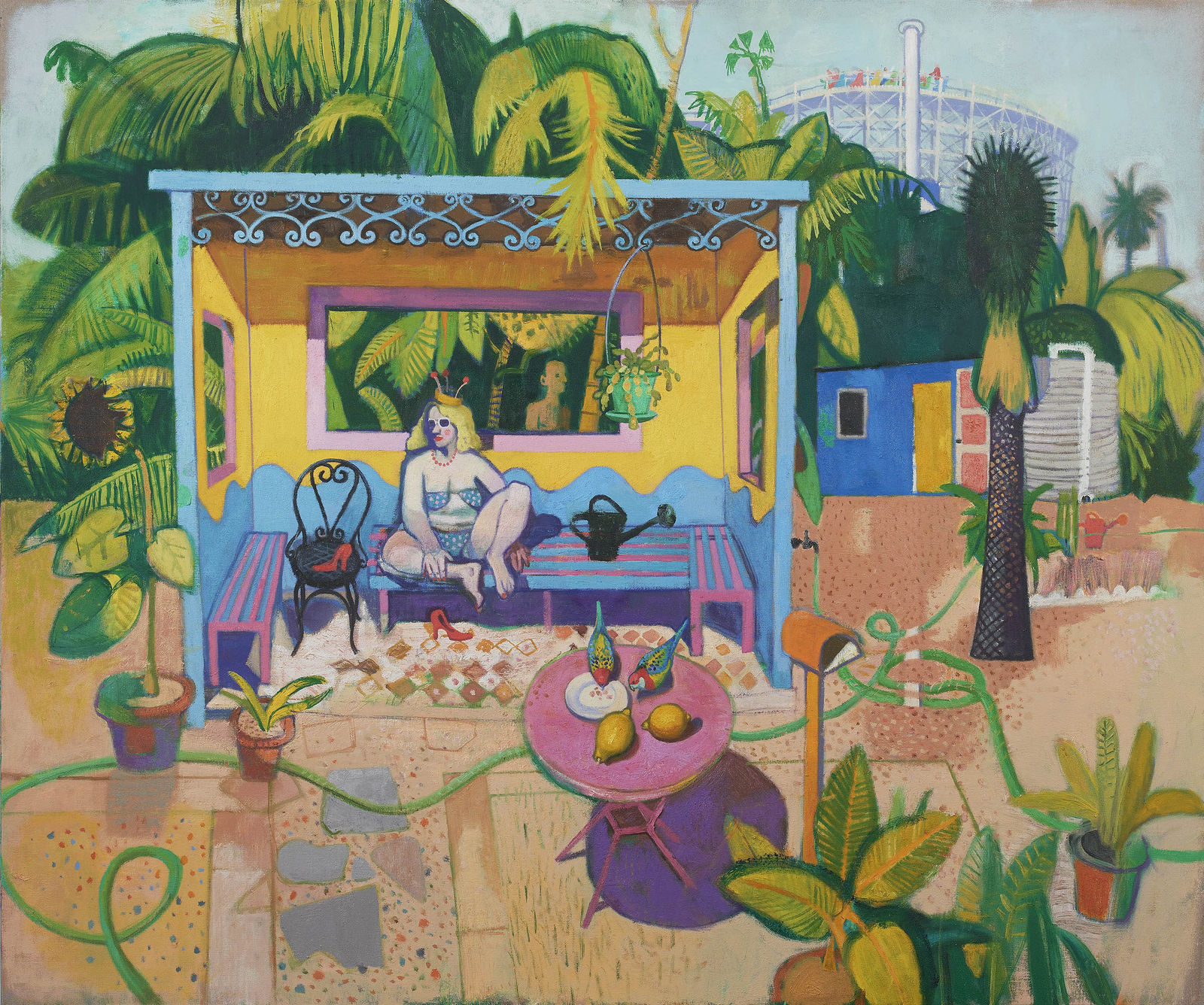 In contrast to these three, however, Leon Morrocco’s art is concrete. His drawing is beautiful, but does not go through a major metamorphosis as it informs his painting. He composes and reorganises what he has seen with great skill, building out of his observations subtle and complex compositions, often on a very large scale. Morrocco was taught initially by his father Alberto Morrocco, a gifted draughtsman and a pupil of James Cowie. Leon has inherited his father’s gift undimmed. His lucid and powerful drawings are a delight. Their discipline brings a sense of order to his painting that allows him to work successfully on a really grand scale. Community Garden, Melbourne, for instance, is five metres across. The picture’s subtitle, The Morning after the Night Before, reflects the human comedy that often enlivens his work. Morrocco’s travels are the matter of his art, ranging from Italy and Greece to India, North Africa and Australia where he lived from 1979 to 1992. The title of his show, Long Road Home, suggests maybe he has travelled enough, but his recent work is of the Alpes Maritime, the mountains behind Nice. The finale to his show is a group of four paintings, all on matching, nearly square canvasses and looking straight into these rocky mountains above green fields and the red roofs of the little towns that huddle at their feet.
